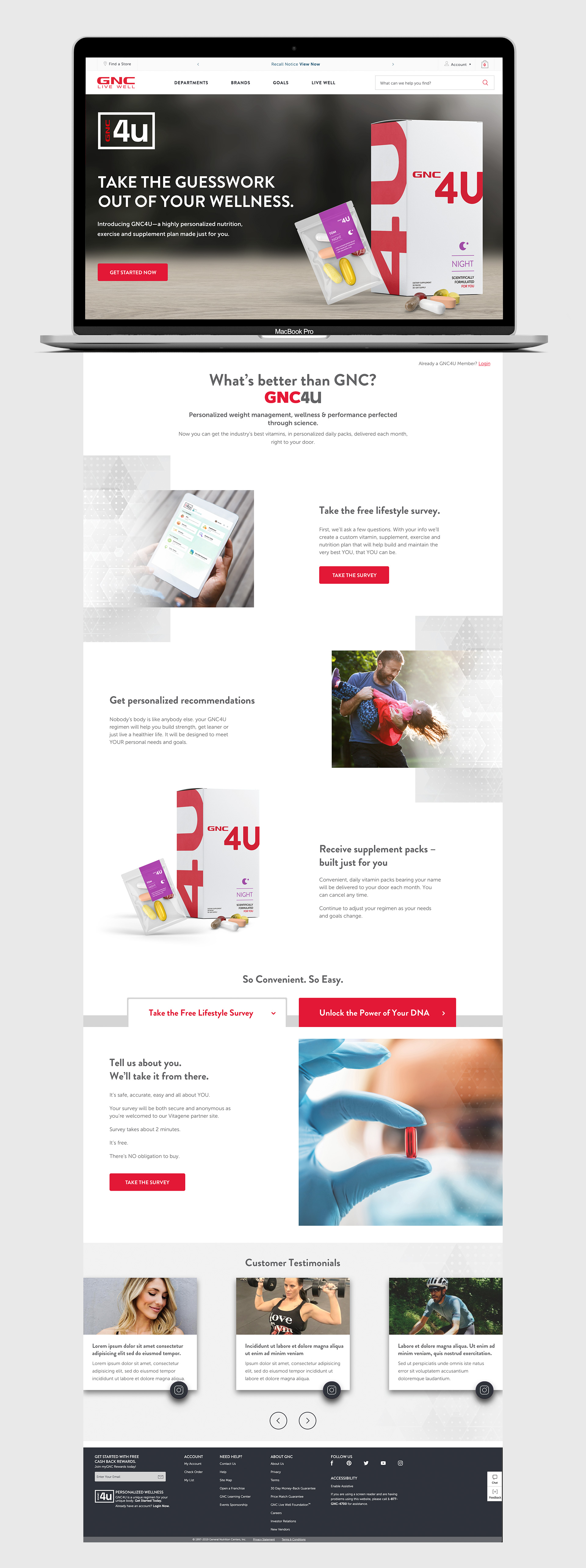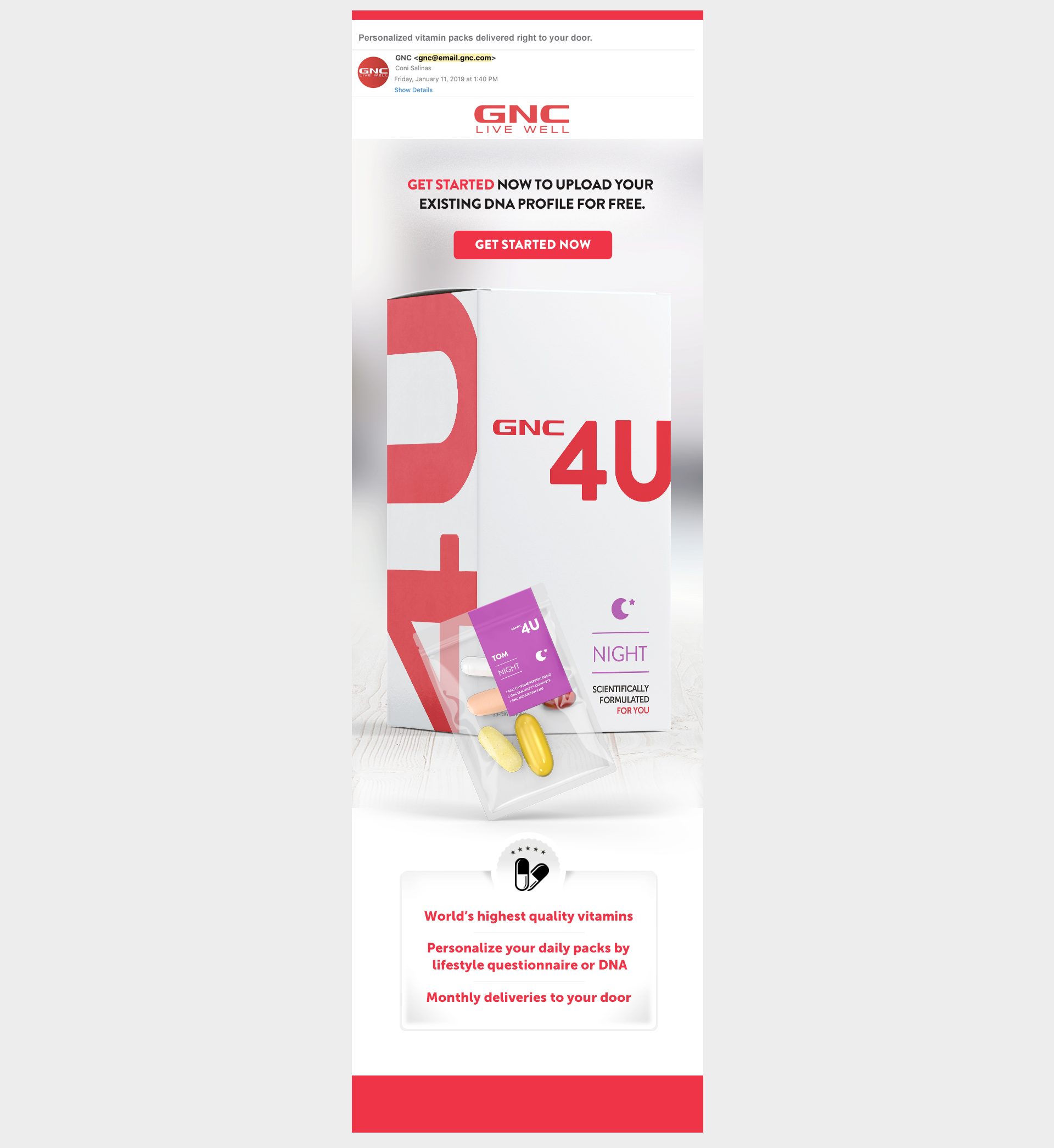 GNC4U is a new product service developed by GNC to provide custom nutritional supplements through DNA testing results.Promotional touchpoints were designed including packaging, web experience, emails, and social content.